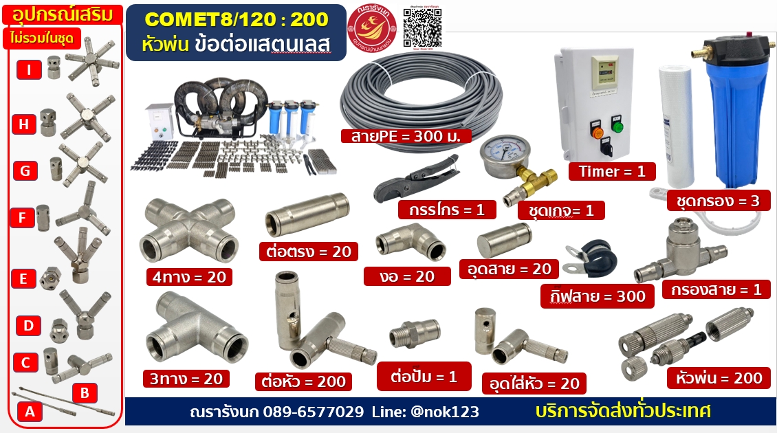 ชุดพ่นหมอกแรงดันสูง 200หัวพ่น ข้อต่อแสตนเลส ปั๊มCOMETอิตาลี